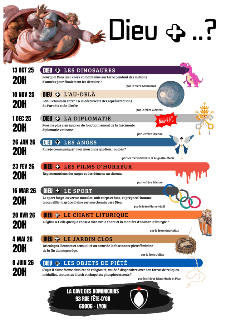 Les frères étudiants de Lyon vous invitent à un cycle de conférences sur Dieu + une diversité de sujets insolites ! Un lundi soir par mois, dans la cave mythique du couvent !